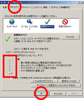 セキュリティ設定にて、「信頼済みサイト」を選択して、「サイト」ボタンをクリックします。